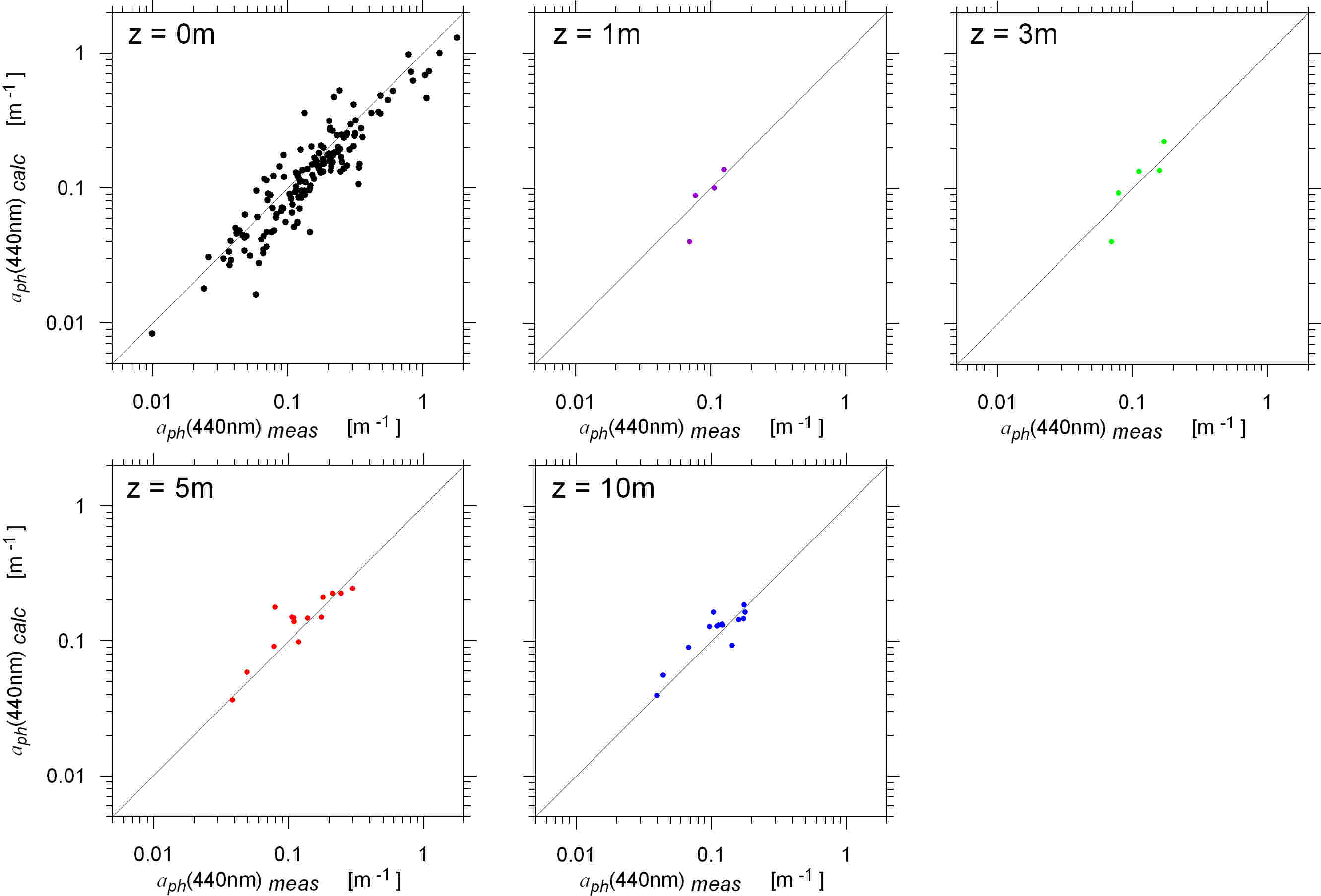 Rys.1 Porównanie empirycznych a*ph(440nm)meas i modelowych a*ph(440nm)calc współczynników absorpcji przez fitoplankton dla długości fali 440 nm na różnych głębokościach z w warstwie eufotycznej Bałtyku. Wartości absorpcji a*ph(440nm)meas zmierzono podczas rejsów naukowych w latach 2010-2014, a wartości absorpcji a*ph(440nm)calc zostały wyznaczone przy użyciu algorytmu DESAMBEM – jedną z danych wejściowych było stężenie chlorofilu a na powierzchni określone za pomocą pomiaru ze statku.Walidacja