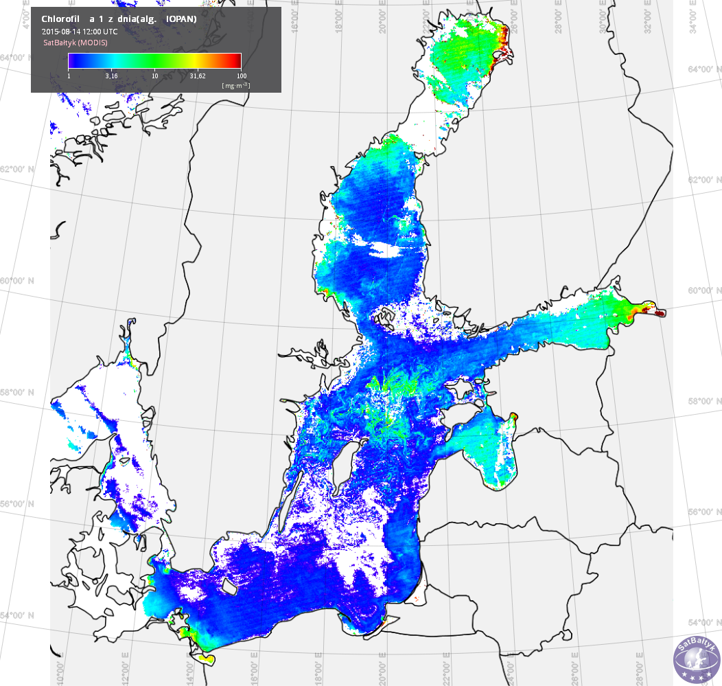W serwisie System SatBałtyk rozkłady stężeń chlorofilu a w przypowierzchniowej warstwie wody podawane są w miligramach chlorofilu-a na metr sześcienny [mg Chl a m-3].