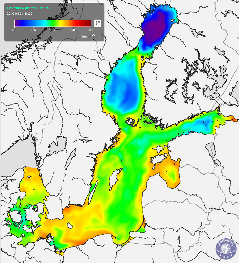Stężenie chlorofilu a obliczone na podstawie biomasy fitoplanktonu wyznaczonej za pomocą modelu ekohydrodynamicznego EcoSat. Mapy stężeń chlorofilu a o rozdzielczości 1 km otrzymywane są poprzez interpelację przestrzenną wyników modelu EcoSat, którego rozdzielczość przestrzenna wynosi od ok. 5,5 km. Obliczenia za pomocą modelu są wykonywane na 18 warstwach o zmiennej grubości, co pozwala obliczyć rozkłady pionowych stężeń chlorofilu a na różnych głębokościach. W serwisie SO SatBałtyk rozkłady stężeń chlorofilu a na powierzchni oraz na różnych głębokościach podawane są w miligramach chlorofilu-a na metr sześcienny [mg Chl a m-3], cztery razy na dobę.