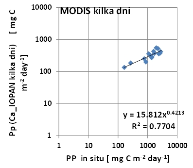 Rys.1Porównanie empirycznych PPIn situ i modelowych PP wartości produkcji pierwotnej w słupie wody pod powierzchnią 1 m2 w Bałtyku. Wartości produkcji pierwotnej in situ PPIn situ zmierzono podczas rejsów naukowych w latach 2010-2011, a wartości modelowe produkcji PP zostały wyznaczone przy użyciu algorytmu DESAMBEM.Metodyka