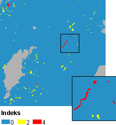 1. Wyraźne plamy zlokalizowane wzdłuż szlaków żeglugowych – duże prawdopodobieństwo występowania rozlewu (wartość indeksu 4)