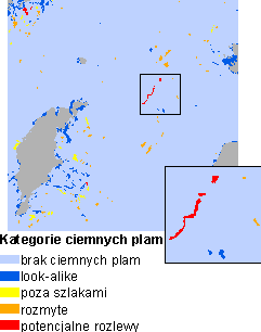 Mapa pokazuje wyodrębnione z obrazów radarowych plamy o charakterystyce zbliżonej do tych, które odpowiadają rozlewom olejowym, podzielone na 2 kategorie (rys.2) :