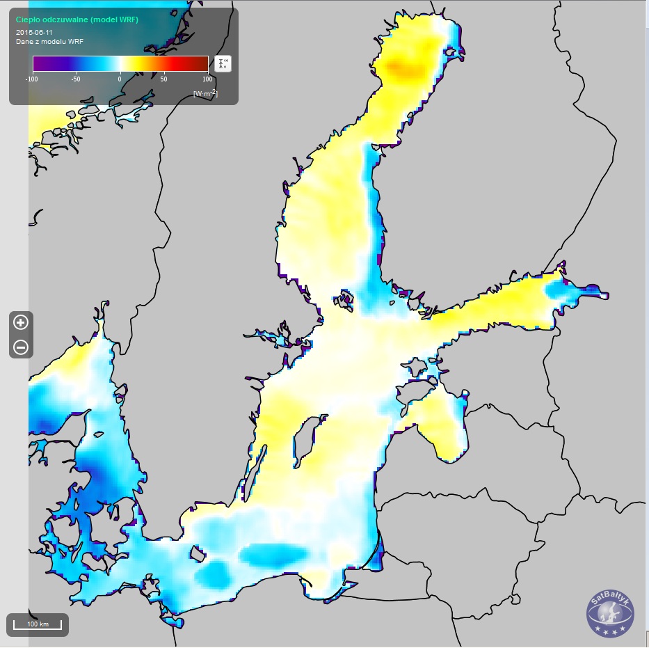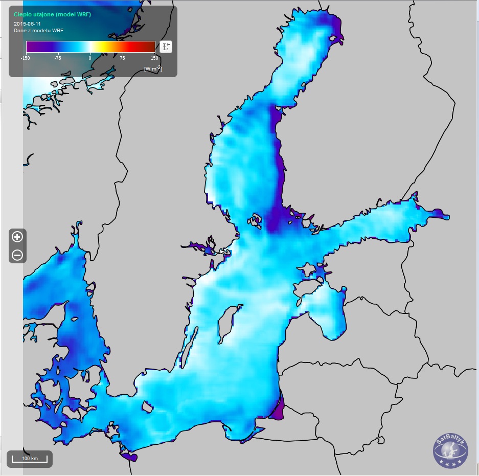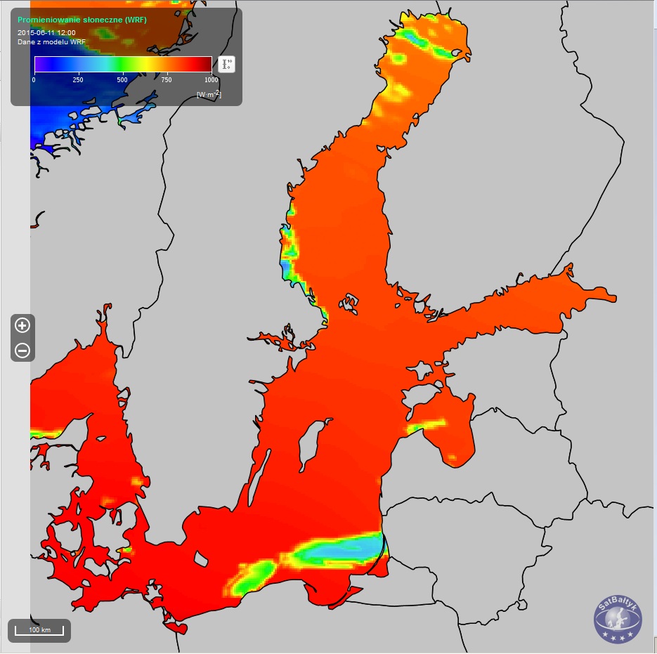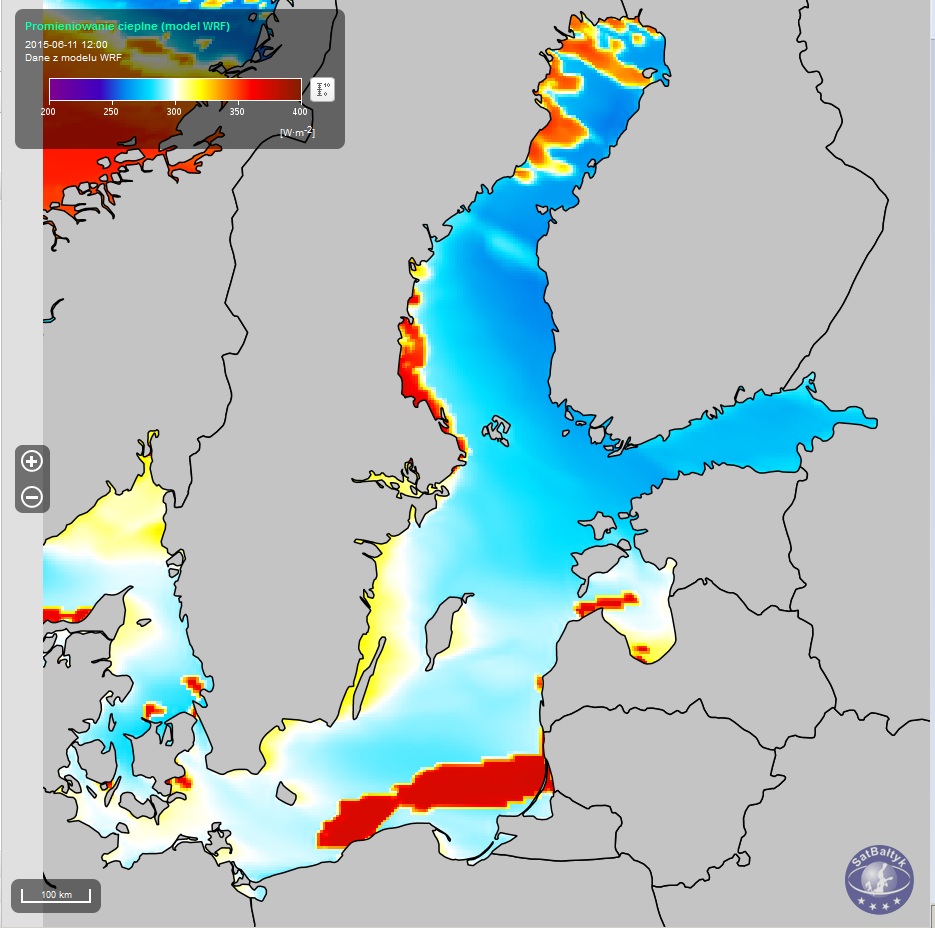 W serwisie SO SatBałtyk rozkłady poszczególnych składowych strumieni ciepła oraz strumieni promieniowania odgórnego nad Bałtykiem podawane są w watach na metr kwadratowy [W/m2], 24 razy na dobę, w postaci map o rozdzielczości 4 km.